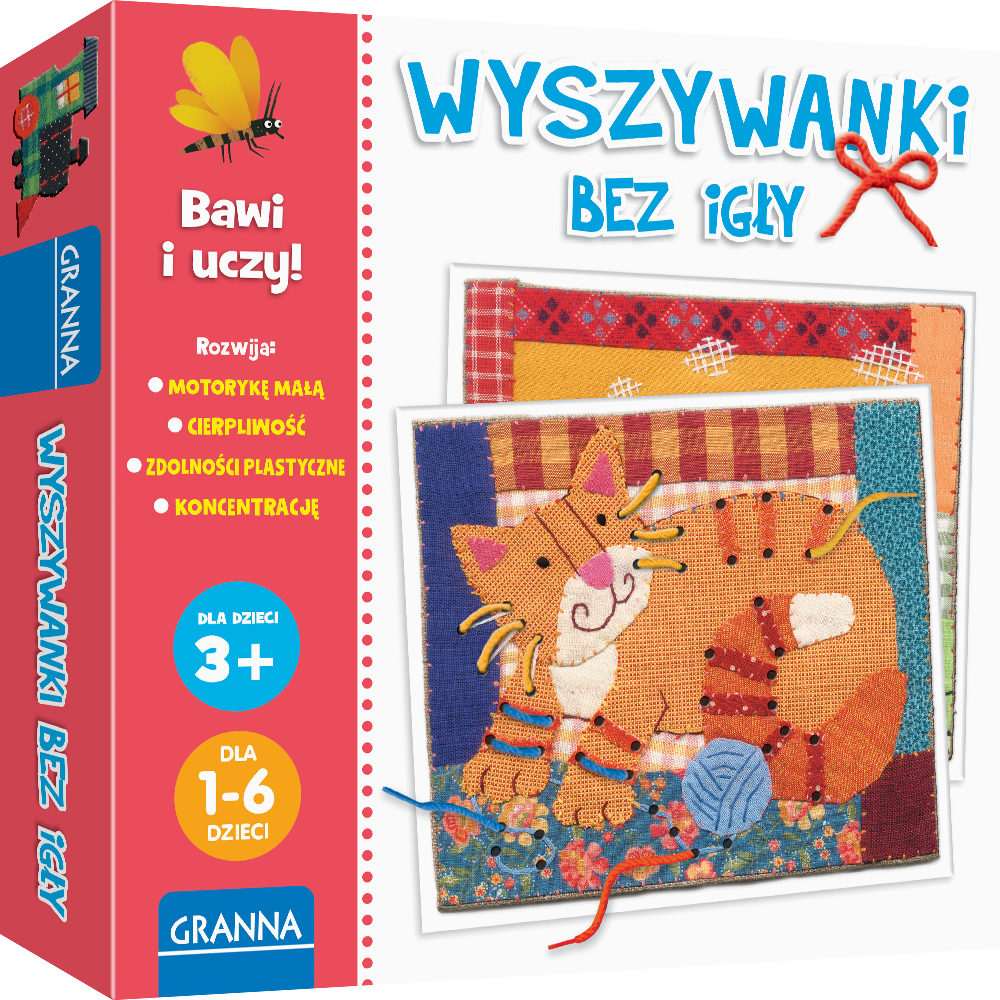 No to do roboty! W pudełku znajdziesz kolorowe sznureczki i piękne patchworkowe obrazki. A na obrazkach zobaczysz lokomotywę, stracha na wróblę, kota, bałwanka i inne cuda. Teraz możesz wyszywać nawet bez igły!